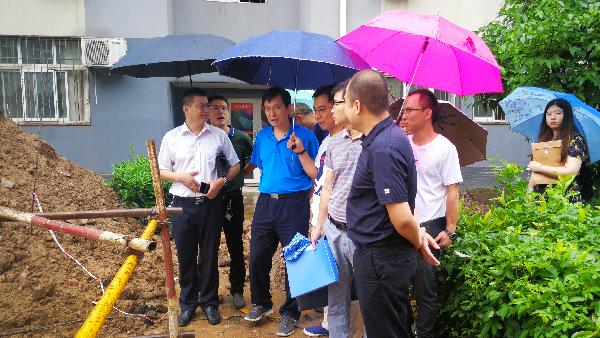 2019年7月29日上午,校务委员曹鸿冒雨深入基层一线,调研学生公寓管网改造项目在建项目施工现场,视察指导工作。基建处、后勤管理处相关负责人陪同调研。